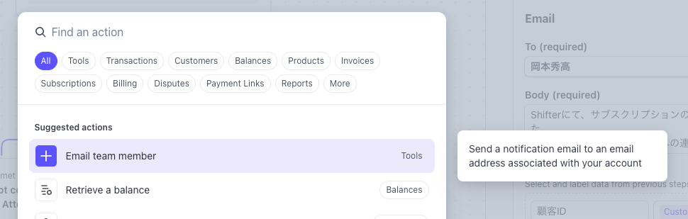 特に便利なのが「Email team member」アクションで、ダッシュボードにアクセスできるユーザーに対してメール通知を送信できます。このメール機能を活用して、外部システムとの連携を実現していきます。