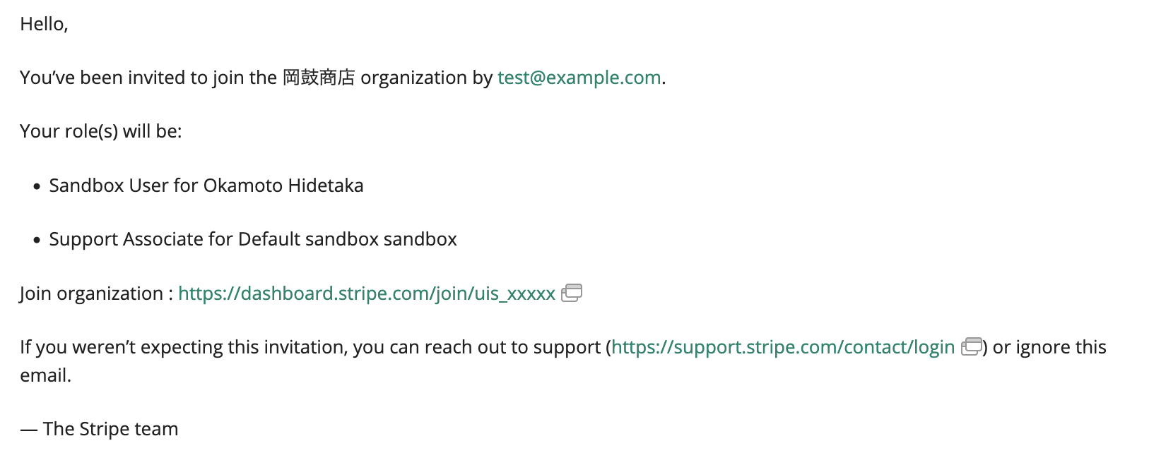 次に、Stripeのダッシュボードでチームメンバーとして、先ほどBacklogで発行したメールアドレスを登録します。新しいユーザーとして招待する形になり、確認メールがBacklogに課題として登録されるため、そこから確認リンクをクリックして登録を完了させます。