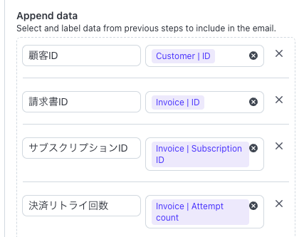 顧客情報であれば「Customer ID」、請求書の詳細であれば「Invoice ID」、サブスクリプション関連であれば「Invoice Subscription ID」、決済試行回数なら「Invoice Attempt count」といったデータを追加できます。これらの情報がメール本文に含まれ、Backlogの課題内容として記録されます。